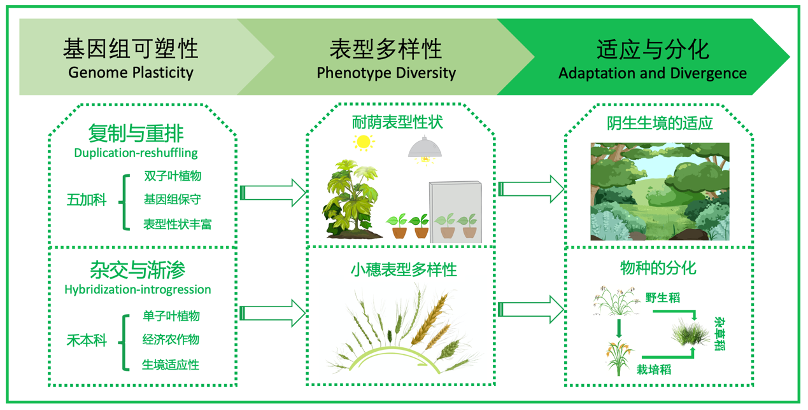 (3) 聚焦于植物防御、耐荫表型与杂草性状等关键表型,揭示“复制与重排”和“杂交与渐渗”等进化机制,促进关键适应性表型性状形成的分子基础 (详见图示)