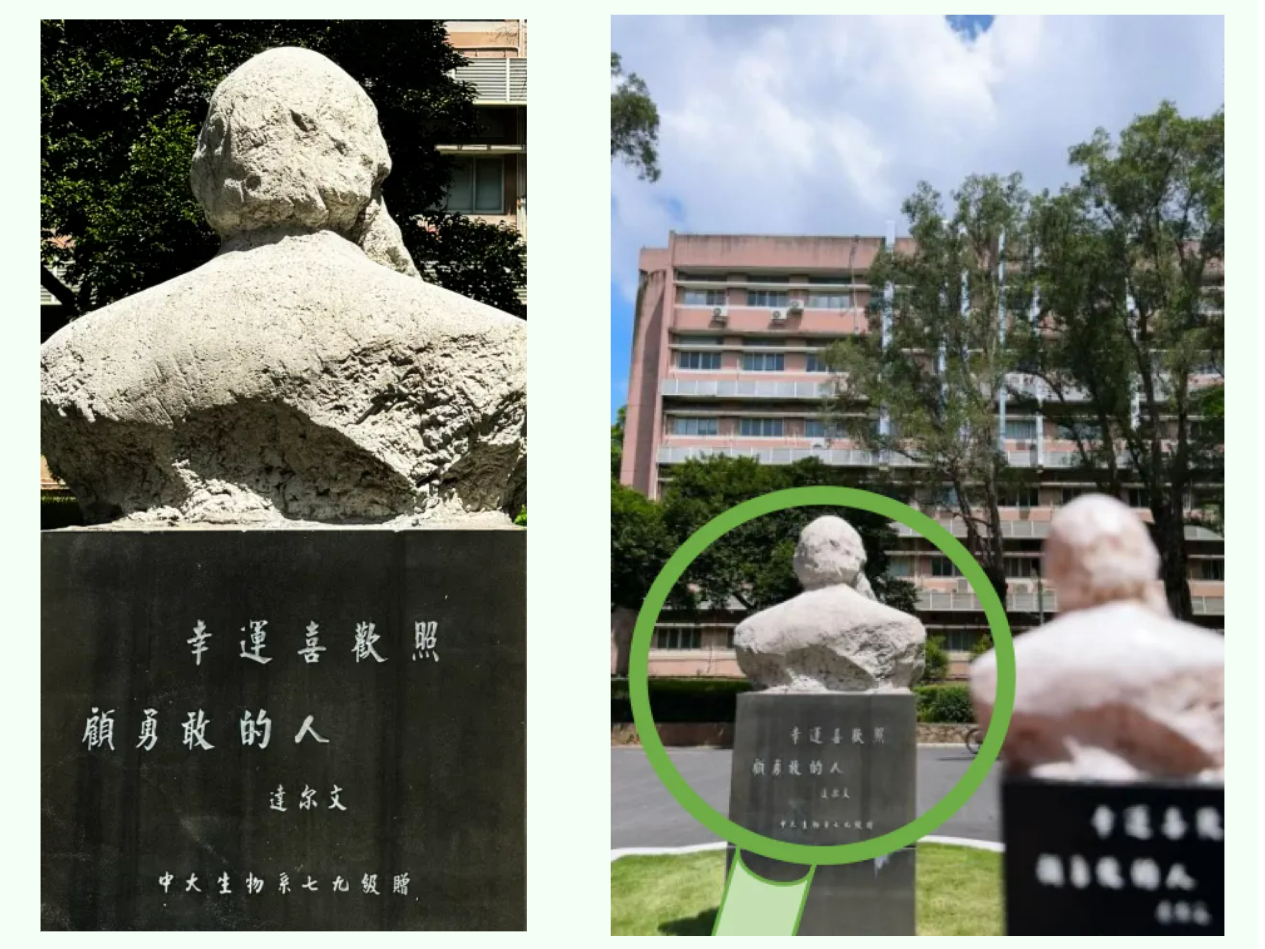 图片摄于生物楼前,达尔文像背面与生科文创“达达”背面