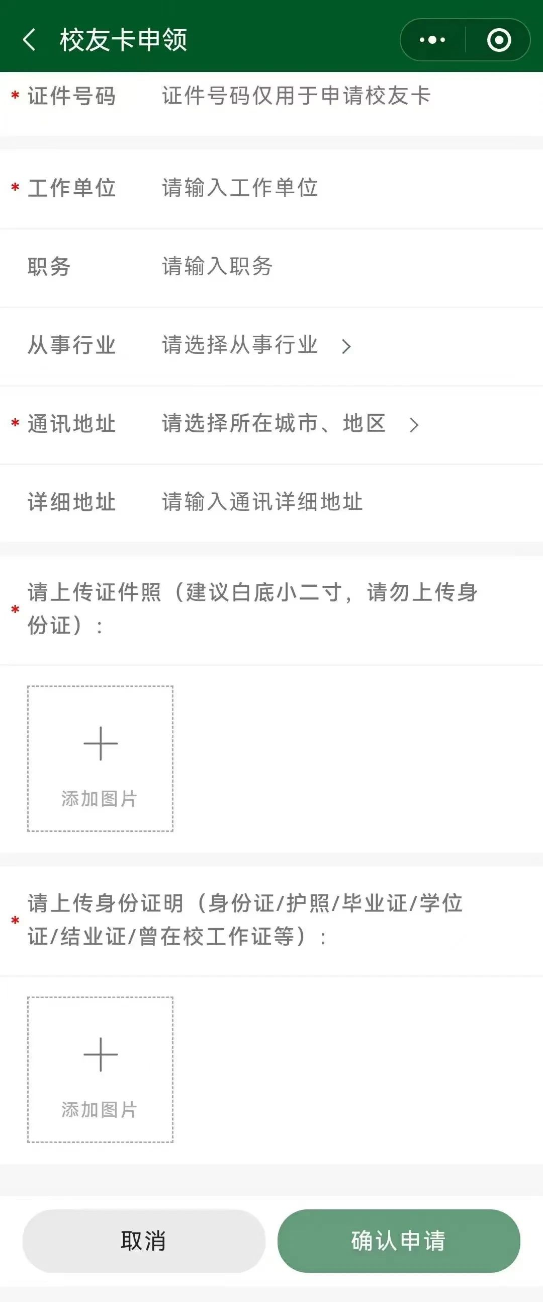 进入校友卡申请填写信息页面,