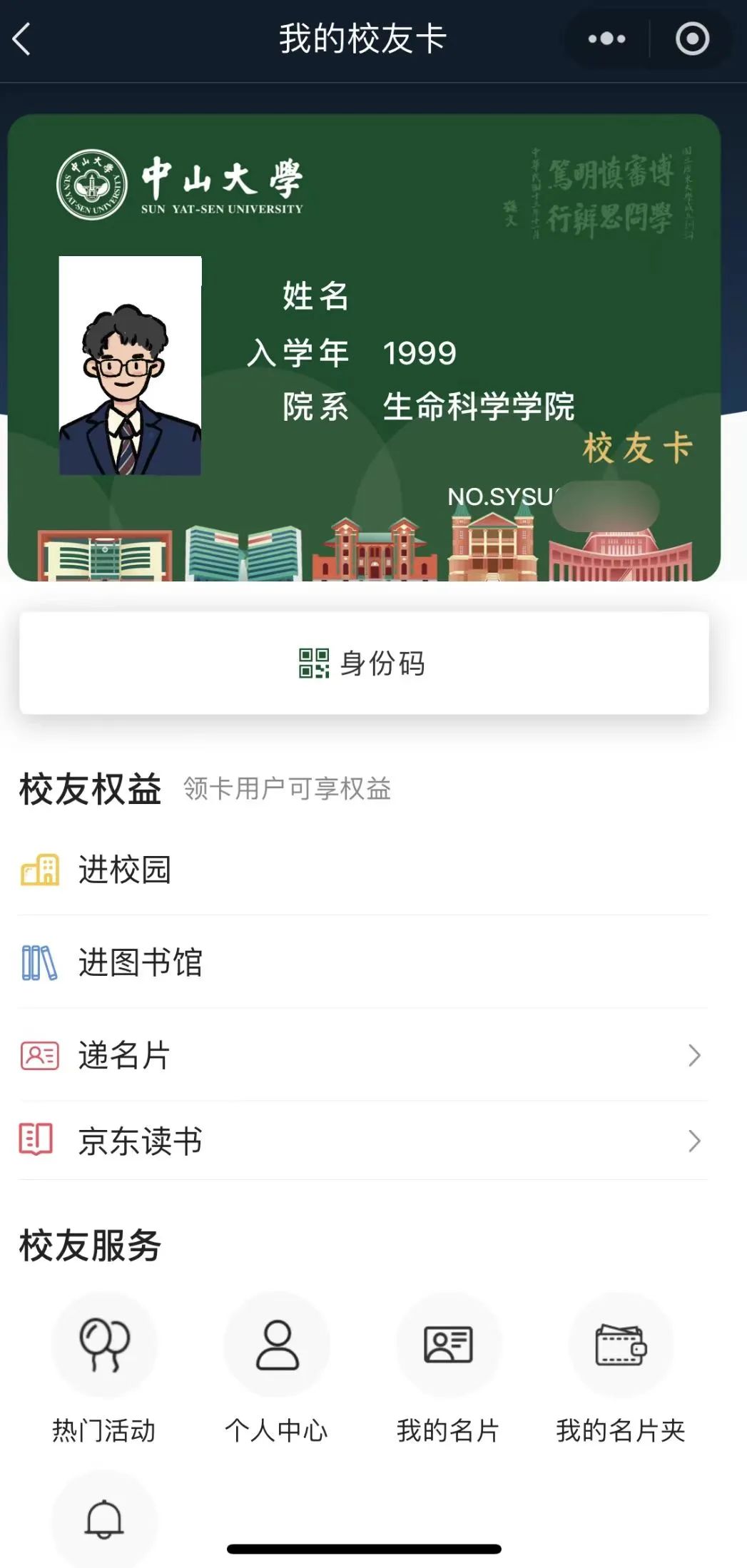 点击主页“电子校友卡”