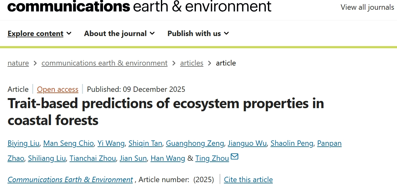 上述研究成果以“Trait-based predictions of ecosystem properties in coastal forests”为题,于2025129日在线发表于Nature旗下期刊Communications Earth & Environment,该研究是继69书吧 周婷团队在Plant, Cell & Environment202412月)利用滨海矮林植物构型揭示其生态特征并实现植被分类后的又一成果。69书吧 2024届刘碧颖博士(现为69书吧 生态学院博士后)为论文第一作者,周婷副教授为通讯作者;69书吧 王毅博士、赵盼盼博士,以及硕士研究生赵文胜、谭诗琴、曾广宏参与了此项工作;彭少麟教授组织了该项工作。合作者还包括亚利桑那州立大学邬建国教授、北京师范大学刘世梁教授、中国科学院青藏高原研究所孙建研究员、周天财博士,以及清华大学王焓副教授。该研究得到了国家自然科学基金(42293354)、南岭国家公园生物多样性综合科学调查(2025267)和国家公园建设专项基金(2021GJGY034)等项目的资助。