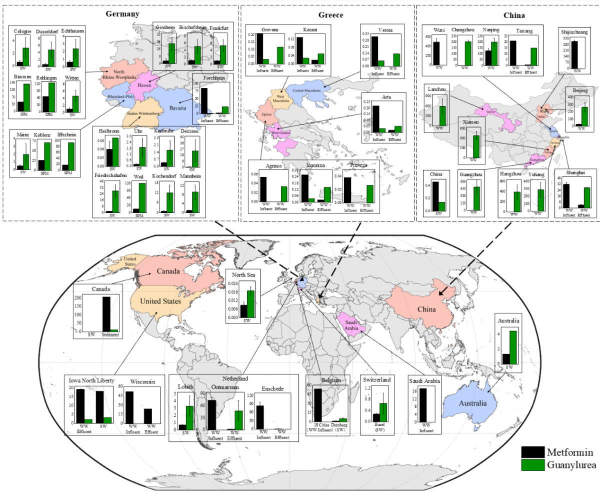 图 1. 二甲双胍及其生物转化产物脒基脲(Guanylurea)的全球分布
