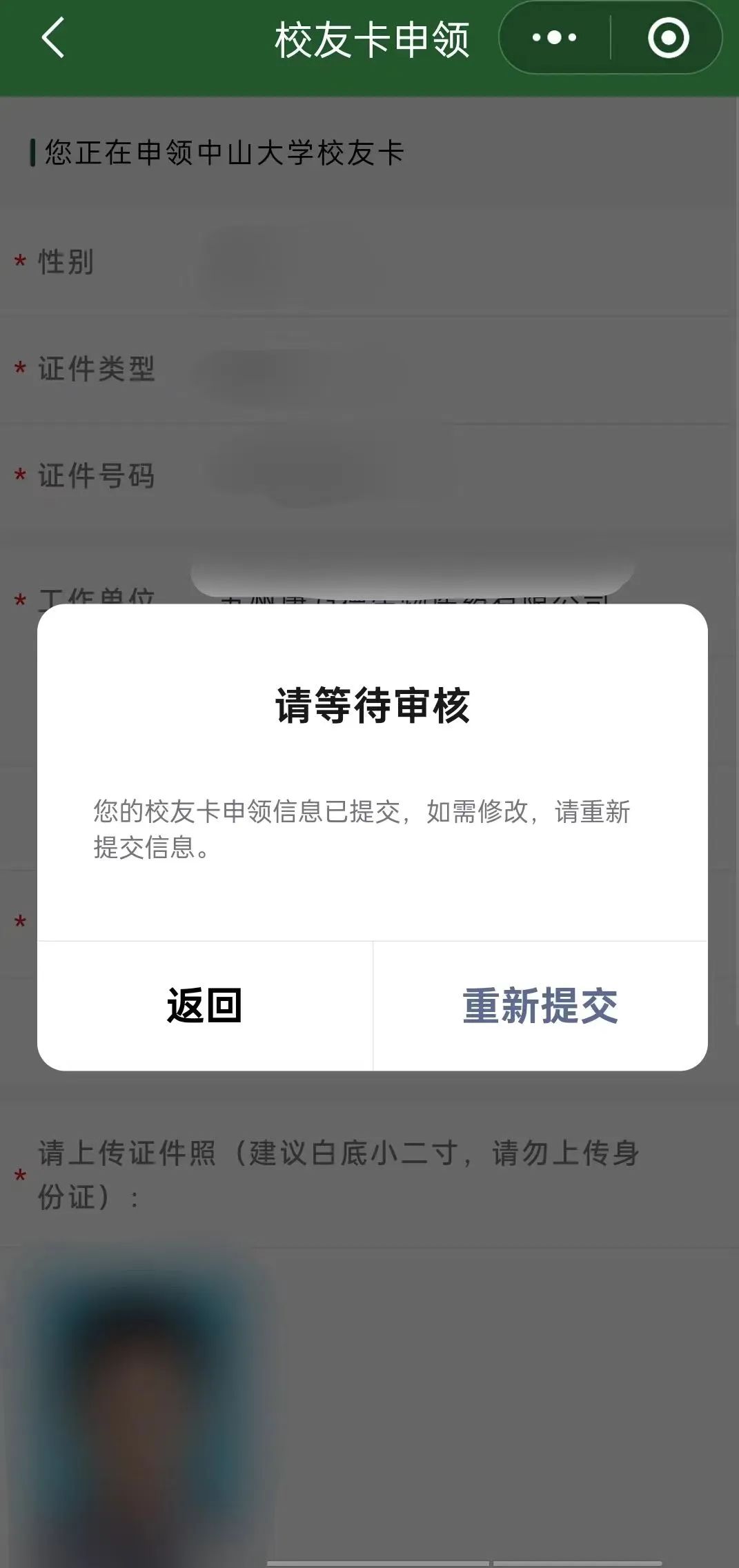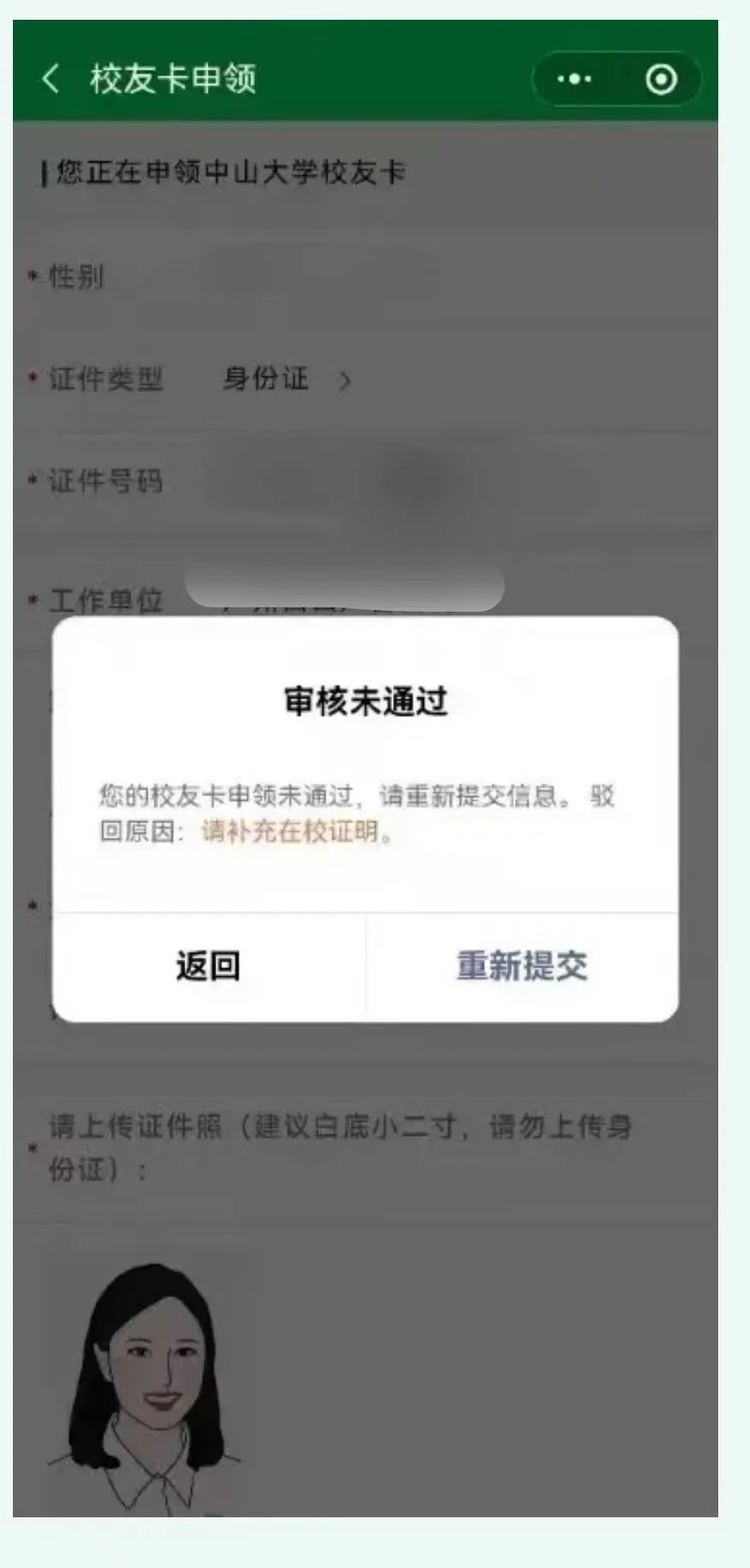如填写信息及资料不正确,校友卡申请信息被驳回,系统提示“审核未通过”,请按提示信息修改或补充材料后,点击“重新提交”。