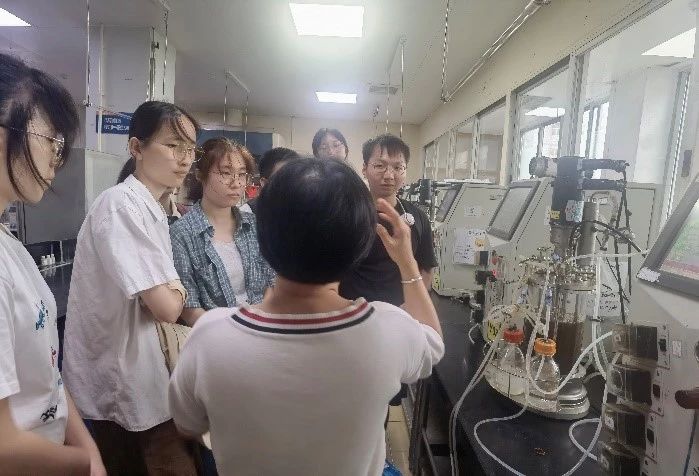 发酵平台将实验室的发酵工艺和微生物菌种等研究成果,通过小试、中试等阶段的放大实验,转化为适合工业生产的成熟技术。将纯化好的菌种逐级放大并接种到5L-100L乃至体积更大的发酵罐中进行发酵,以对实际生产中可能出现的问题进行及时的预测和解决。同学们在菌种小试平台主管的带领下,参观了发酵罐的空消、实消,以及接种、移种等全套流程,通过观摩和实践,同学们不仅学习到了发酵过程中的关键操作技能,还直观地了解从实验室到生产线的全过程,增强了对专业知识的理解和应用能力。