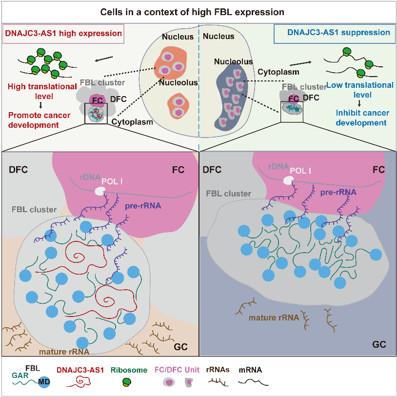 图. lncRNA DNAJC3-AS1 调控高蛋白浓度下FBL凝聚状态的模式图:lncRNA结合多个FBL并局部遮挡GAR domain,抑制因GAR-GAR间过度互作导致的FBL类固态凝聚,维持FBL液相流动性(图左);敲低lncRNA,高蛋白浓度下FBL GAR domain间互作增强,促进FBL发生类固态凝聚(图右)