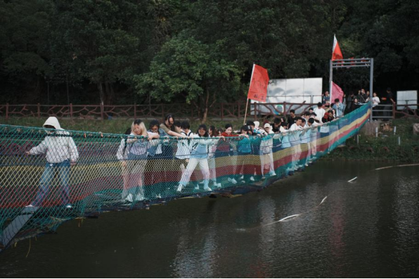 随后,各队同学来到了泸定桥边,进行白日的最后一项活动——飞夺泸定桥。不顾不断暴起的水柱,不顾不断摇晃的断桥,领队同学一马当先,同学们也争先恐后,踏上这条艰险的“泸定桥”。途中可能会有恐惧,但全程没有一位同学放弃,最终所有同学都越过这条艰险的断桥,抵达对岸。