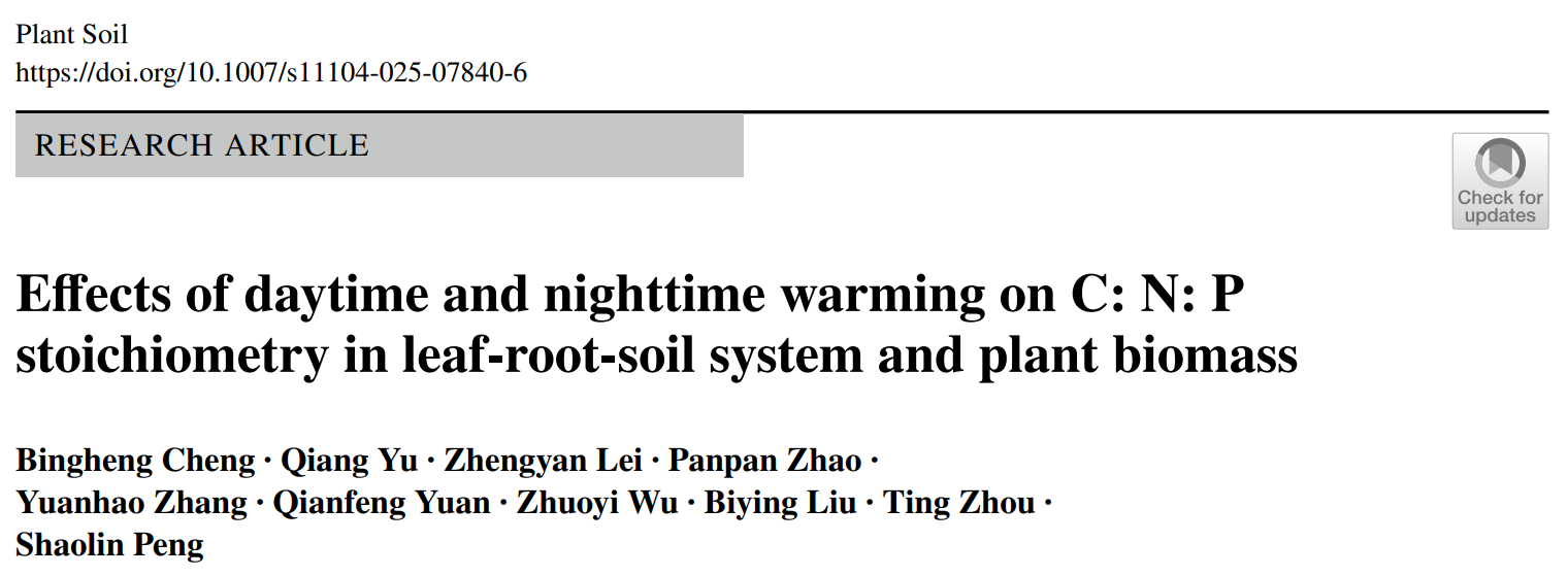 该研究于2025年9月5日以“Effects of daytime and nighttime warming on C: N: P stoichiometry in leafrootsoil system and plant biomass”为题在Plant and Soil上发表,该研究是继69书吧 周婷团队在Geoderma(2024年5月)发现全球变化昼夜增温下土壤微生物群落多样性变化的新模式后的又一成果。69书吧 2023级博士生程炳衡为第一作者,周婷副教授为通讯作者,北京林业大学庾强教授参与了该项工作,69书吧 研究生雷正艳、赵盼盼、张圆浩、袁前锋、吴卓忆和刘碧颖为共同作者,彭少麟教授对文章做出了重要贡献。该研究得到了广东省自然科学基金和南岭国家公园生物多样性综合调查等多个项目的资助。