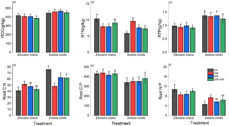 Fig. 2. Effects of daytime and nighttime warming on the contents and stoichiometric ratios of C, N and P of roots in Eleusine indica and Setaria viridi.