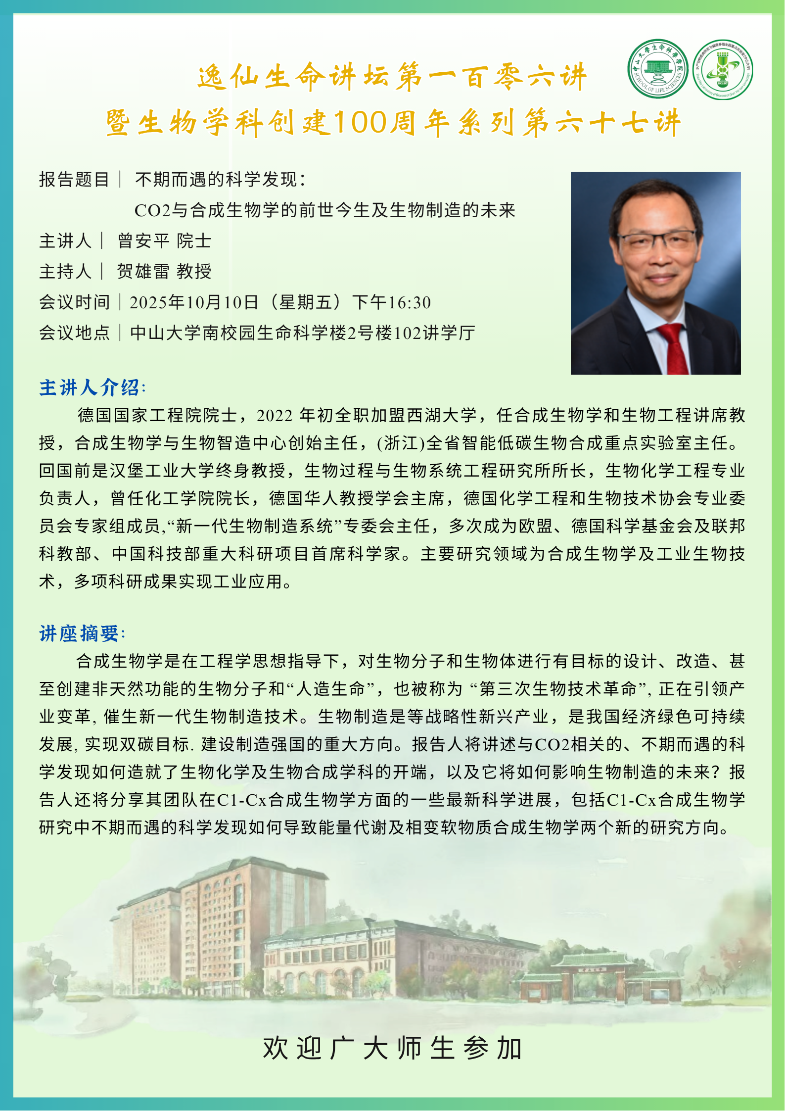 导航痕迹 69书吧 科学研究 学术讲座 生物学科创建100周年系列第六十七讲:不期而遇的科学发现:CO2与合成生物学的前世今生及生物制造的未来 扫描此二维码分享 生物学科创建100周年系列第六十七讲:不期而遇的科学发现:CO2与合成生物学的前世今生及生物制造的未来 发布人:董静飞 发布日期:2025-10-09