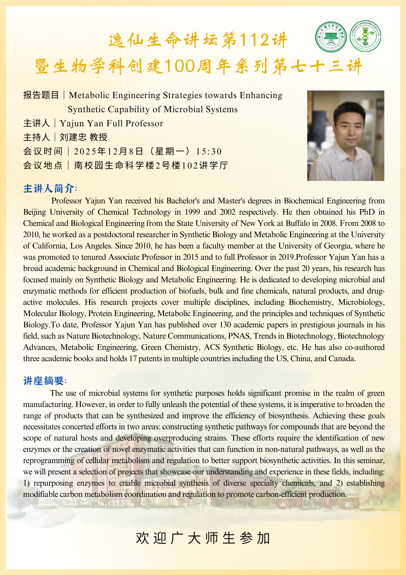 导航痕迹 69书吧 科学研究 学术讲座 生物学科创建100周年系列第七十三讲:Metabolic Engineering Strategies towards Enhancing Synthetic Capability of Microbial Systems 扫描此二维码分享 生物学科创建100周年系列第七十三讲:Metabolic Engineering Strategies towards Enhancing Synthetic Capability of Microbial Systems 发布人:董静飞 发布日期:2025-12-02