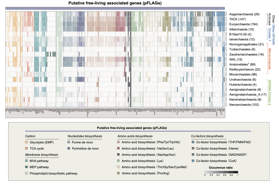 进一步的比较基因组学分析表明,微古菌门具丰富的代谢途径,尤其是其中的Norongarragalinales 古菌目,具有高度完整的氨基酸、核苷酸、辅酶因子以及细胞膜从头合成通路,其代谢潜能与自主生活的 DPANN古菌 Altiarchaeota、自主生活的阿斯加德古菌、TACK 古菌、广古菌等高度相似,可能存在自主生活潜能。本研究将与之相关的代谢通路的基因归纳为潜在自主生活基因(potential free-living associated genes,pFLAGs)。而另一些微古菌门类群,例如土地、灶神古菌目,以及红孩儿古菌属,则高度精简化,与此前发现的精卫古菌目类似。
