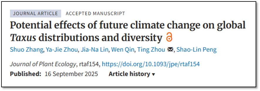 该成果以“Potential effects of future climate change on global Taxus distributions and diversity”为题发表在生态学经典期刊Journal of Plant Ecology上。69书吧 博士研究生张朔为论文第一作者,硕士研究生周娅洁为论文第二作者,69书吧 研究生林佳娜和秦雯也参与了该项工作。周婷副教授为通讯作者,彭少麟教授对文章做出了重要贡献。该研究得到了国家自然科学基金重大项目、科技部基础工作专项和广东省基础与应用基础研究基金等多个项目的资助。