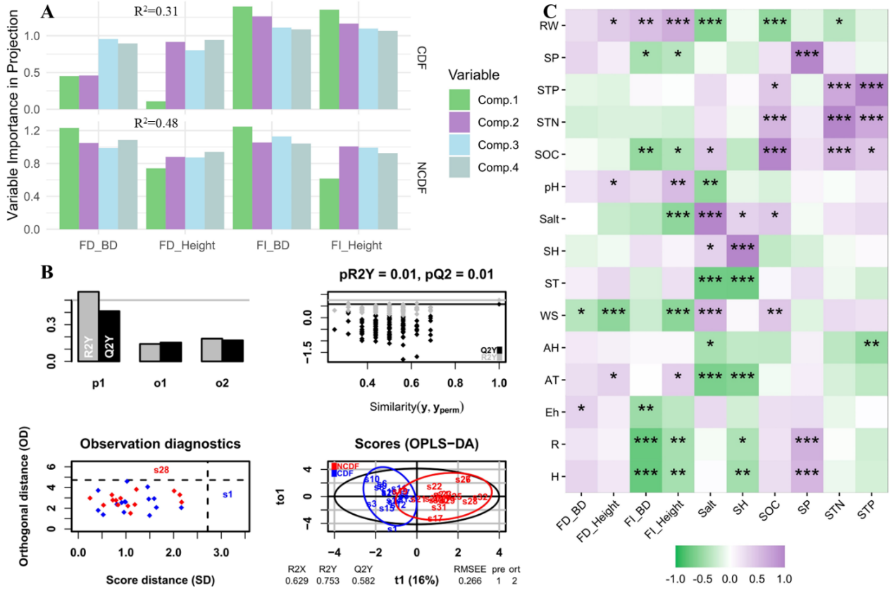 研究结果表明,在滨海森林生态系统中,植物高度(Height)和基径(Basal Diameter, BD)是描述群落特征的关键性状。与非滨海矮林相比,滨海矮林(CDF)的植物高度和基径分别显著下降了31.09%和22.19%(图1)。这些性状变异有效地捕获了植物在资源获取、利用和胁迫耐受等过程中涉及的生物和非生物信息。
