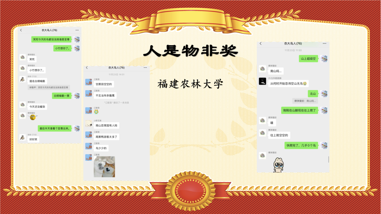 安徽农业大学的同学在观鸟时不慎进入一处企业园区,而后被工作人员发现并差点报警,颁发“我是良民奖”以纪念。