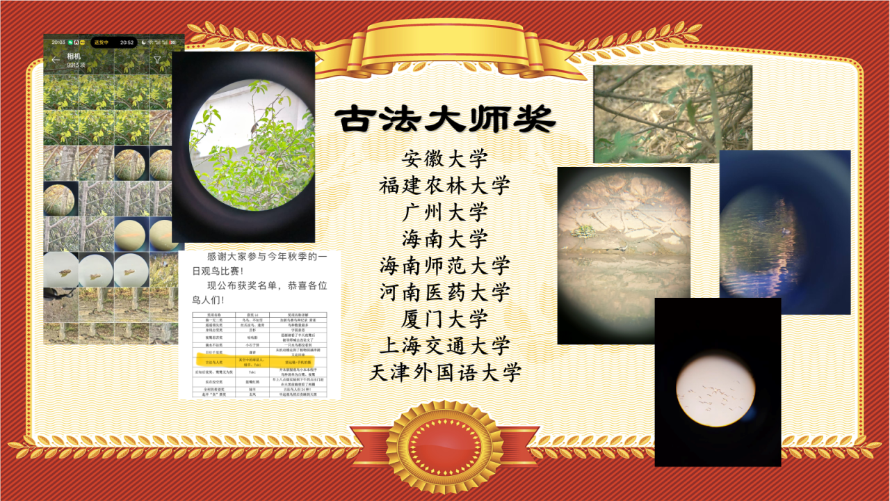 这个奖项颁给各位“原教旨主义观鸟人”们——谁说只有相机能拍鸟!让我们祝贺以下队伍:安徽大学、福建农林大学、广州大学、海南大学、海南师范大学、河南医药大学、厦门大学、上海交通大学、天津外国语大学,为我们提供众多精彩的古法鸟片