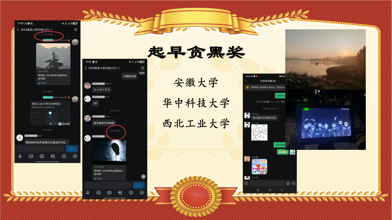 这个奖项致敬各位鸟赛卷王,他们有的从0点一过便开始夜观,有的凌晨五六点便起床观鸟,有的临近半夜还奋斗在夜观一线,令人钦佩。让我们祝贺安徽大学、华中科技大学、西北工业大学的朋友们获得“起早贪黑奖”!