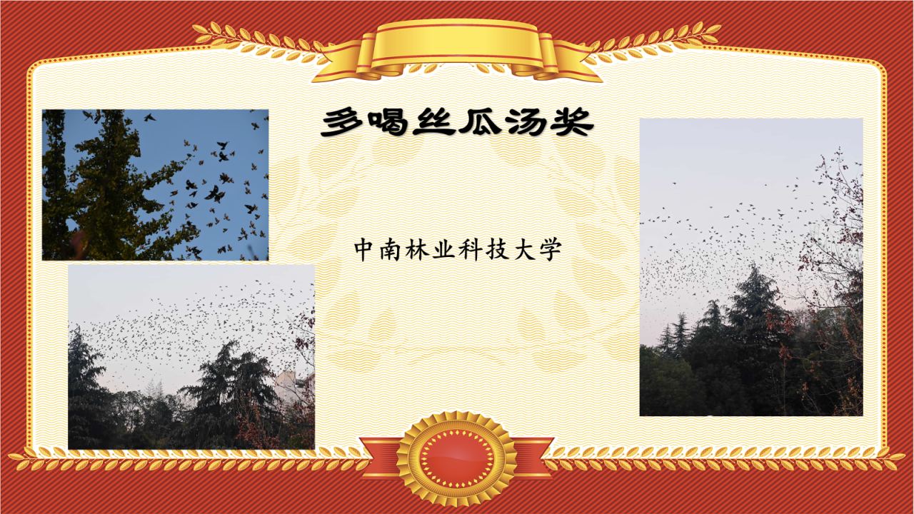 如图中展示的,这些密密麻麻的小黑点,全都是由集群的丝光椋鸟组成,何其壮观!这一幕发生在鸟赛当日的中南林业科技大学校园中,故颁发“多喝丝瓜汤奖”以纪念!