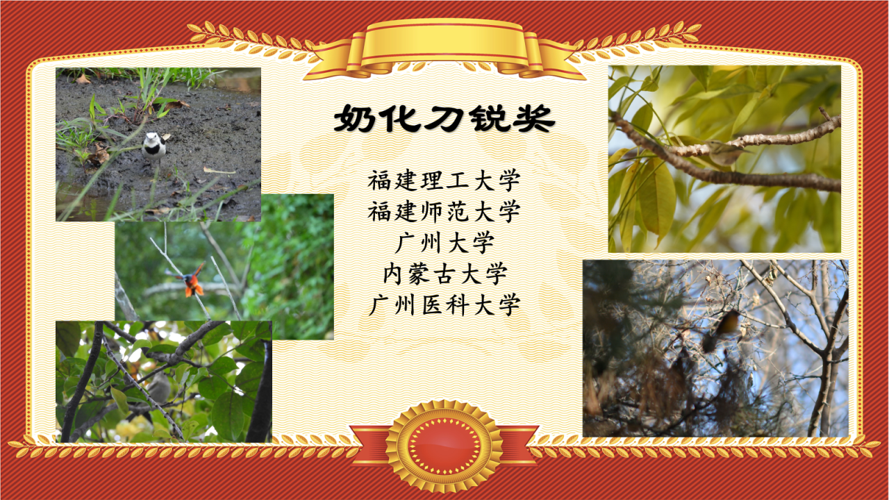 “刀锐奶化”,意为“主体如刀锋般锐利,背景如奶油般化开”;而当拍鸟人遇到某些“活爹”时,往往会产生“主体如奶油般化开,背景如刀锋般锐利”的状况——比如本次鸟赛中,福建理工大学、福建师范大学、广州大学、内蒙古大学、广州医科大学拍到的这些照片。让我们把“奶化刀锐奖”颁给上述队伍!