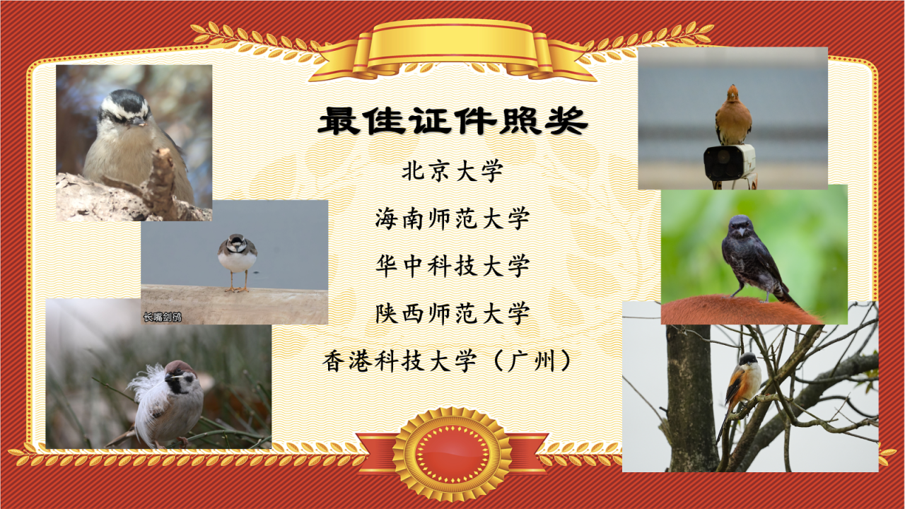 在本次鸟赛中,北京大学、海南师范大学、华中科技大学、陕西师范大学、香港科技大学(广州)的同学们拍到了鸟类的高清“证件照”,有的展示了鸟儿的绝佳正脸,有的具备极强的艺术感和叙事感——让我们把“最佳证件照奖”颁发给以上队伍!