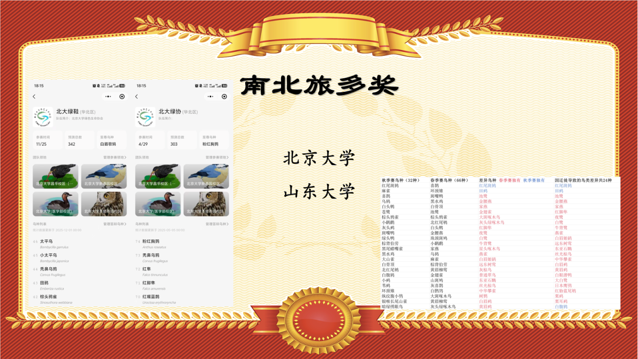 由于鸟赛举办的时间通常在春秋迁后期,部分学校在春秋季鸟赛的成绩差距较大,例如北京大学和山东大学,在上届(春季)鸟赛中分别获得74种、66种的记录,而本届鸟赛只有46种和32种,锐减了将近一半的鸟种,故颁发“南北旅多奖”以纪念。