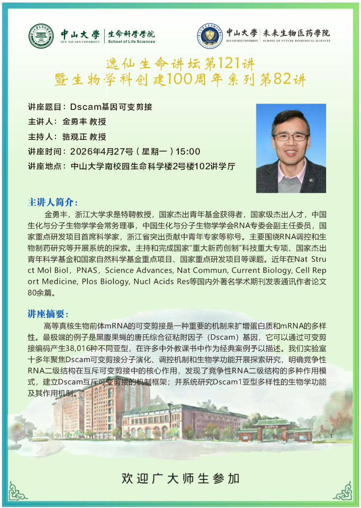 导航痕迹 69书吧 2026年4月27日逸仙生命讲坛121讲:Dscam基因可变剪接 扫描此二维码分享 2026年4月27日逸仙生命讲坛121讲:Dscam基因可变剪接 发布人:李晶 发布日期:2026-04-22 活动时间 2026年04月27日 15:00 - 2026年04月27日 17:00